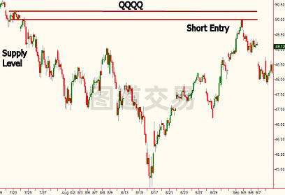在9月4日上周,QQQQ在我们的供应(阻力)水平处反弹,并从这个水平下跌了2.00美元。为什么我如此重视市场的转折点,将其作为交易的切入点呢?为什么不直接在趋势明显或突破时介入呢?原因很简单……那些能够根据纯粹供需的客观和简单规则来预测市场转折点的交易者,通常能够从那些在趋势已经形成后才跟进的交易者,以及那些在一段上涨后买入、在一段下跌后卖出的突破交易者那里获得收益。许多人忘记了买卖任何东西赚钱的基本原理。 当你买入时,为了盈利,必须有很多人在你之后以更高的价格买入。当你做空时,为了盈利,必须有很多人在你之后以更低的价格卖出。我们上周的入场点是在预先确定的转折点下方,这为我们带来了两个好处。首先,它允许我们在非常接近保护性止损的位置进行做空,从而保持交易的低风险。其次,它允许我们在远离下方需求水平的地方做空,这些水平将是我们的利润目标。换句话说,我们的供应区域让我们在利润空间最大且即将减少时进行做空。永远不要忘记……等待的时间越长,价格下跌得越多,做空的风险就越大,而你的回报(利润空间)却在减少。与其在做空之前寻求更多的价格下跌确认,不如在供应(阻力)处寻求低风险入市的利益。