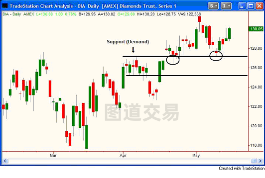 如上图所示,当价格突破并稳定在交易活动密集区域之上时,该区域便转化为一个重要的需求水平。这一转变为长期交易者提供了若干有利的交易机会。这种价格行为背后的逻辑是,对道琼斯指数成分股的需求在该价格水平上超过了供应,导致了供需失衡。当价格回调至这一区域时,我们可以理解为存在卖家在需求依然超过供应的价位上卖出,这正是我们寻找的新手卖家行为。