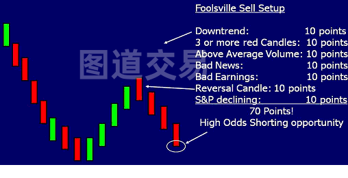 我抵达愚人镇财务委员会中心,准备好了与镇上最聪明的愚人进行重要会议。我的议程是收集他们的交易和投资策略信息,并告诉他们我的看法。其中一位男士告诉我,唯一可能打断会议的是市场出现买入或卖出信号。除此之外,我拥有他们的全部注意力。在我们讨论策略之前,他们告诉我整个镇子会把他们的资金集中起来进行交易。我问他们这样做的目的是什么,他们回答说:“既然每个人都被教导在同一时间买入和卖出,并且我们都持有相同的哲学,我们认为把所有资金结合起来,一次进行一大笔交易是有意义的。”愚人镇的交易策略是一个非常基于规则的评分系统;让我来解释一下。他们有七个可能或可能不存在的交易机会标准。每个标准都值得10分。根据他们的策略,分数越高,交易机会越好。因此,70分是他们能拥有的最佳交易机会。我将用一个愚人镇的卖出设置的例子来解释,其中行动是押注价格下跌,做空。