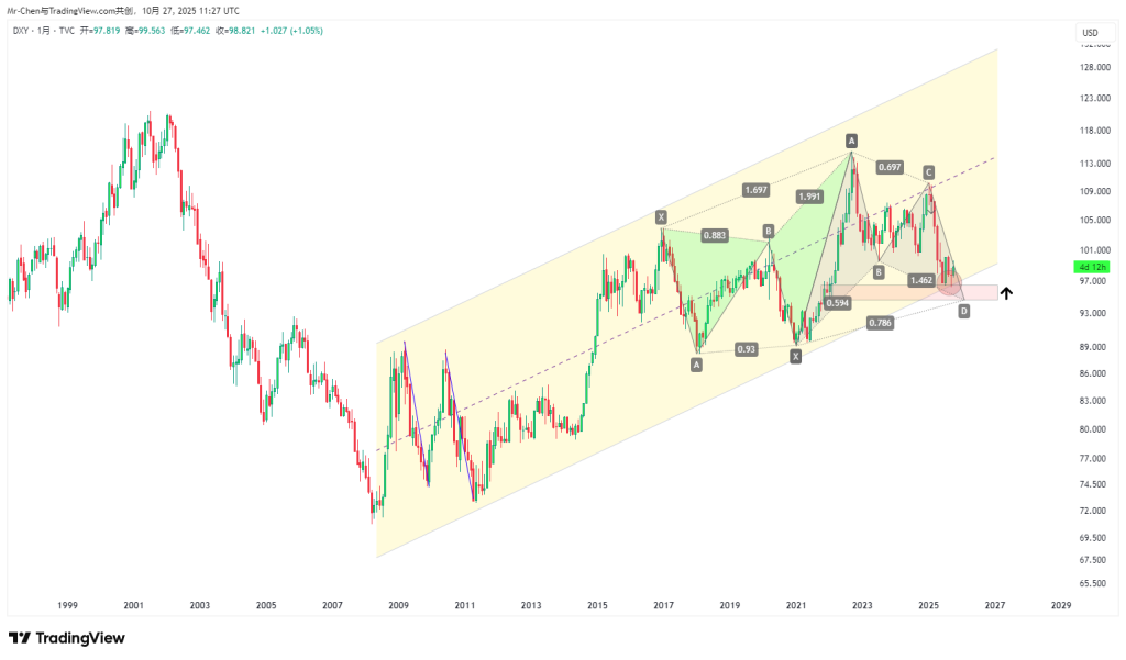 图一是月线级的一个上行通道,价格已跌至通道下沿 图二是周线,走了个双针探底的结构,后市看涨