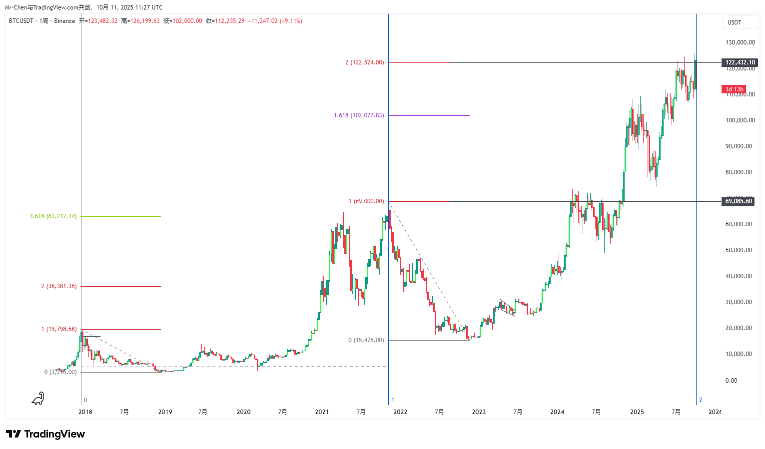 如下图,以过去两次大顶为基础,当前时间节点是1:1的位置 同时当前BTC上涨的动能不断衰减、2.0回撤,小心趋势拐头