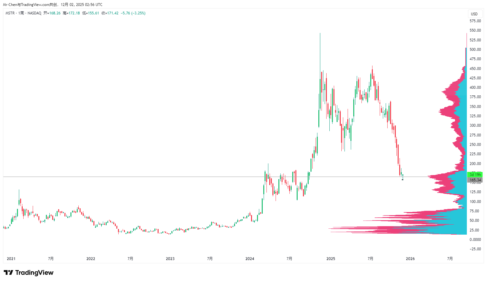 MSTR周线ABCD的D点已到位,同时扎进筹码密集区