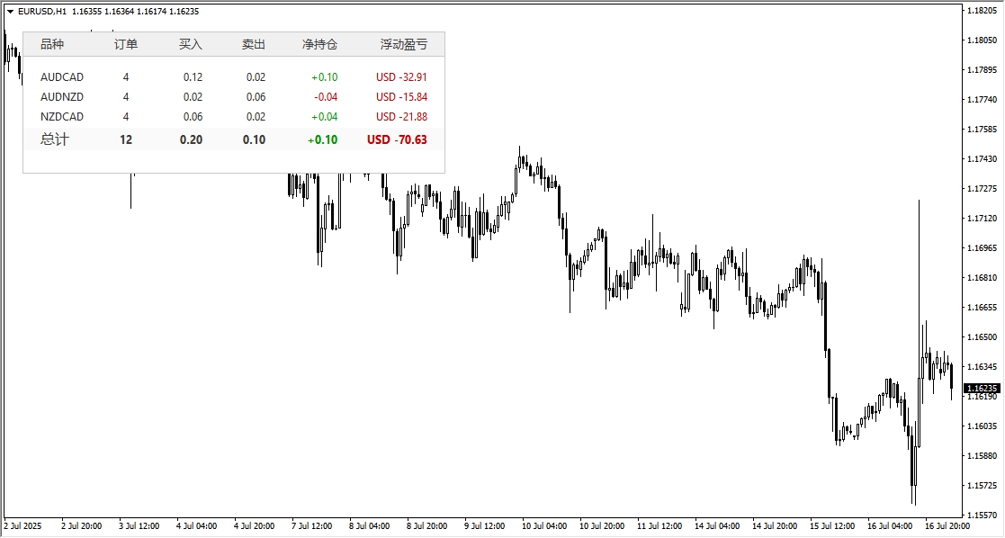 它的功能是在图表主窗口的左上方以一个表格形式,实时统计您当前账户中所有持仓订单的详细信息。可以让交易中的你对账户的整体持仓状况、风险和浮动盈亏一目了然。