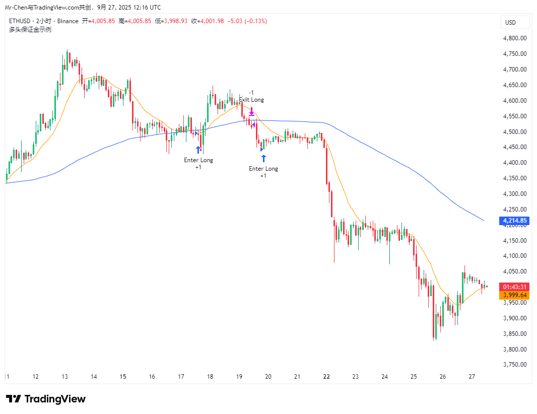 strategy(title="多头保证金示例", overlay=true,default_qty_value=100, initial_capital=25000)